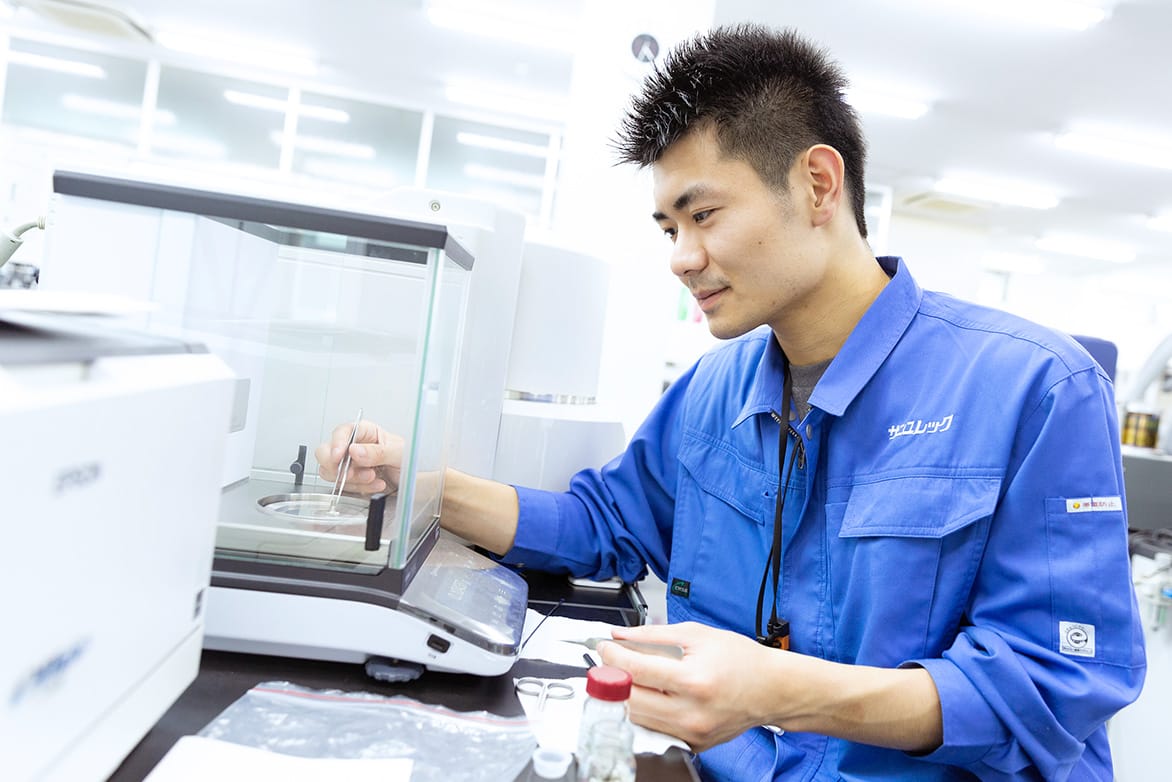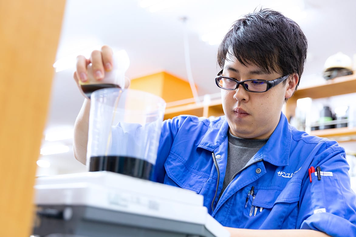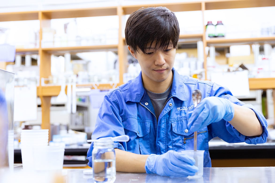 建設材料事業部で、新たな製品を生み出すための研究を行っています。そのほかの担当業務として、既存製品の原材料を別の原材料に置き換えることが可能かを検討する作業も行っています。