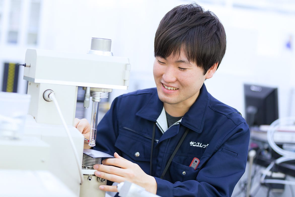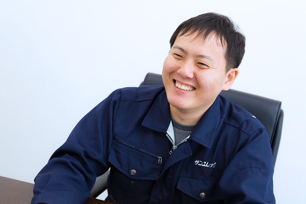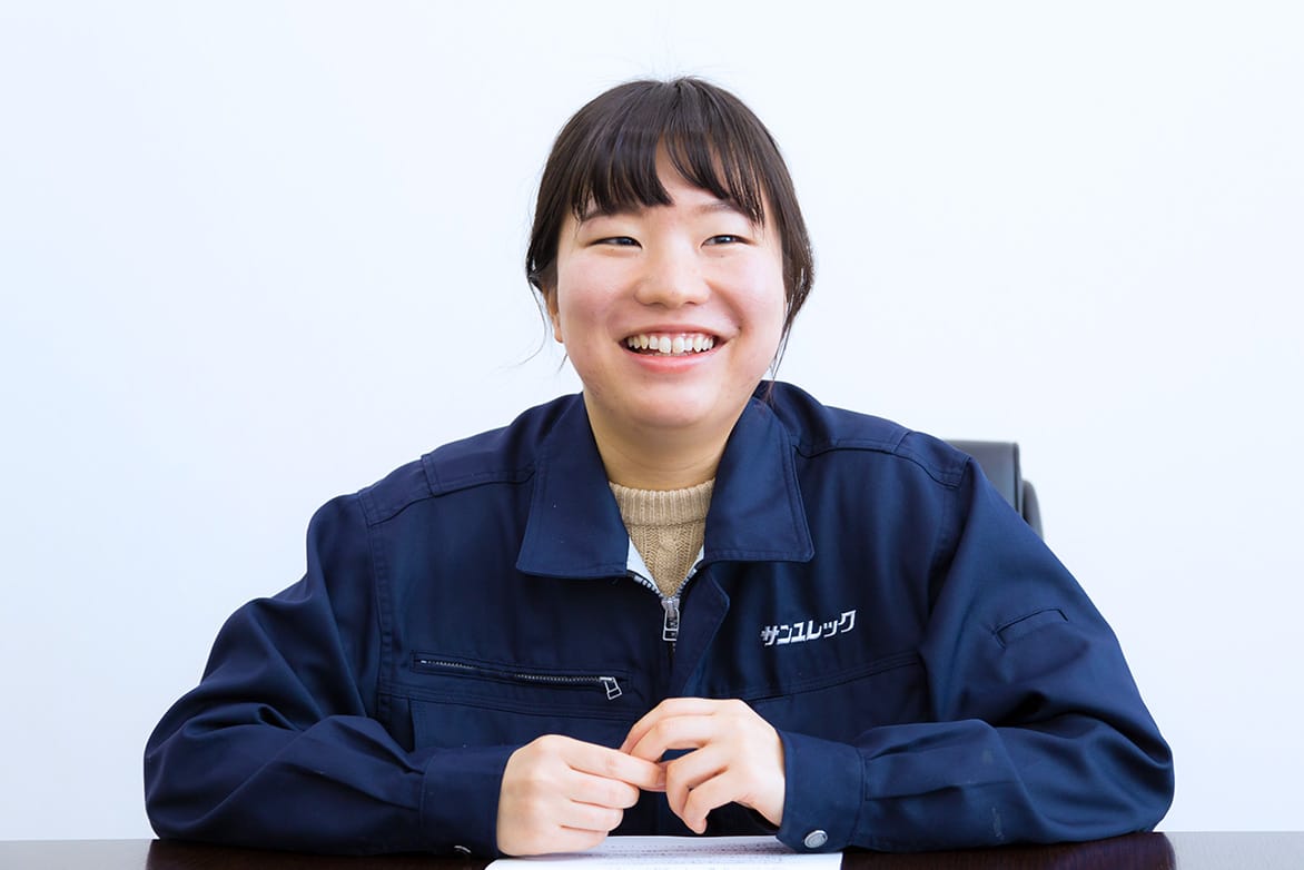 就職活動中にサンユレックのWebサイトを見て、「この会社なら面白い仕事ができそう」という印象を受けたことと、サンユレックで働く先輩から「テーマに縛りがなく、色んなチャレンジができる」という話を聞けたことが決め手になりました。