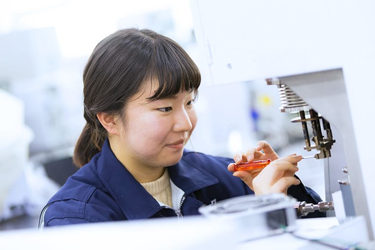 まだ世の中に出ていない、新たな材料の分析・評価業務を担当しています。先輩社員の開発のサポートをすることも、私の大切な役割です。私が取り扱っているのは、まったく新しい材料ですから、どのような分析・評価の結果が出るのかを予想することができません。